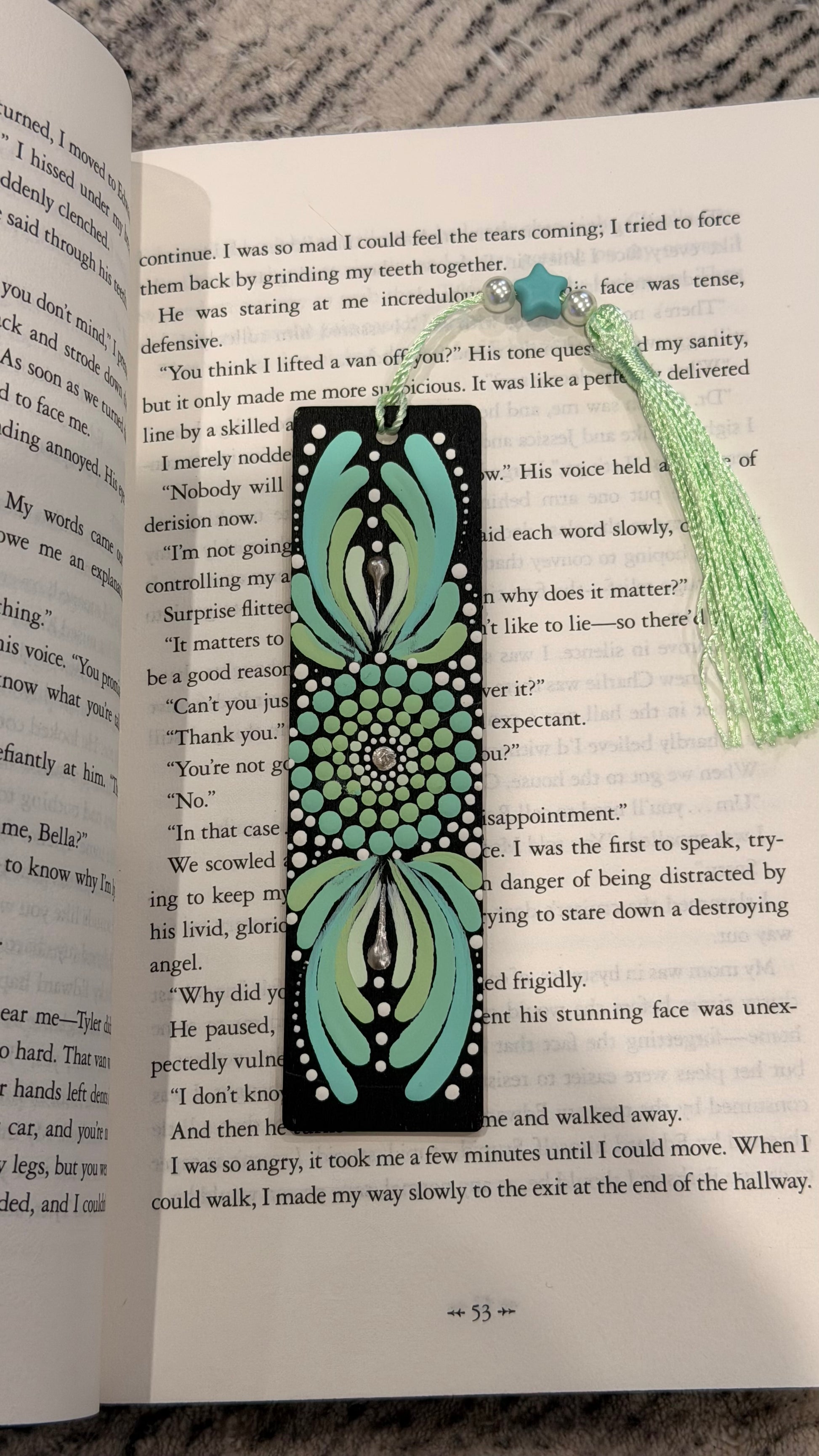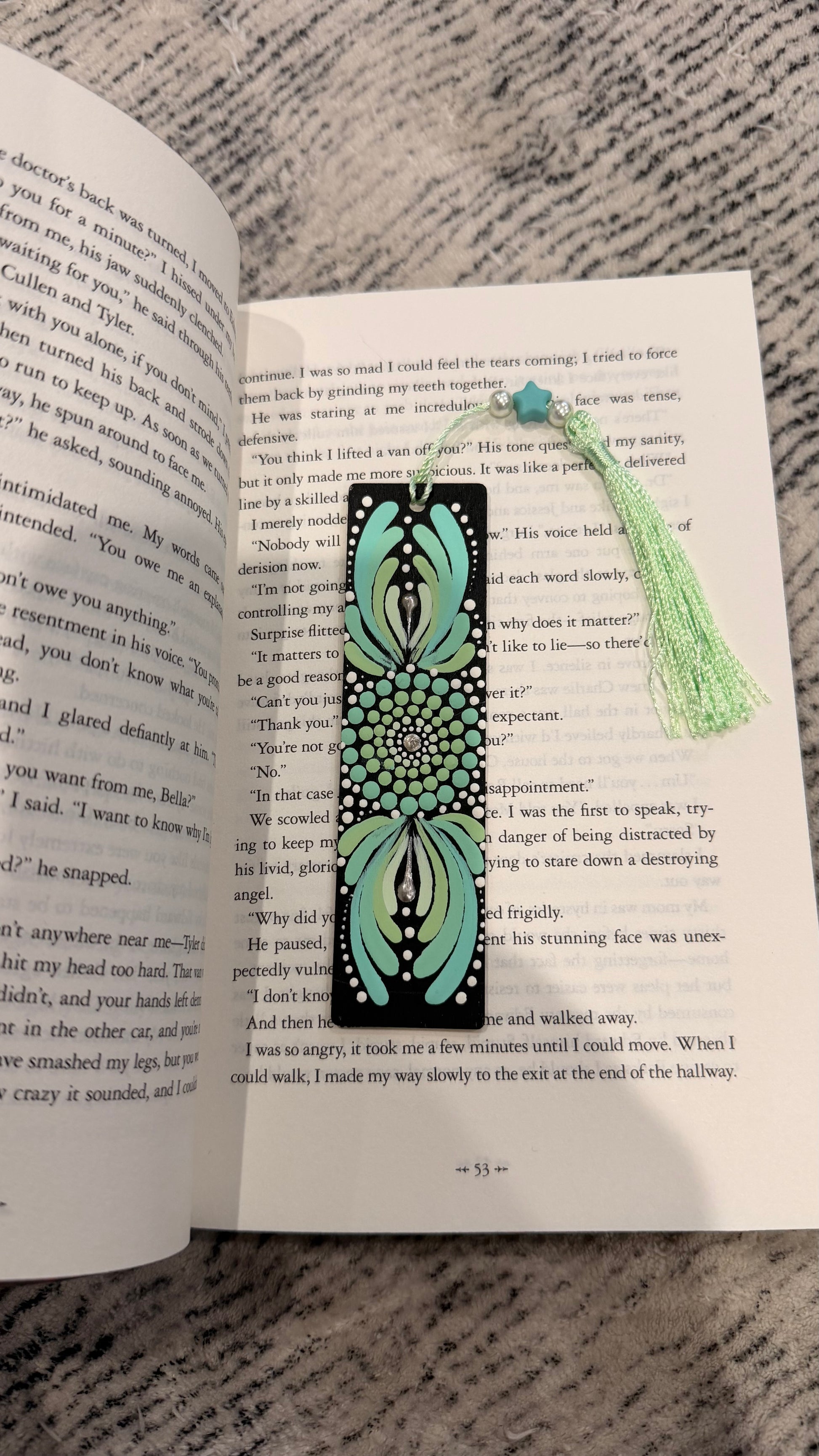 Elevate your reading experience with this one-of-a-kind, hand-painted mandala bookmark. Featuring intricate mint and sage green dot-work on a sleek black wooden base, this piece is more than just a page-holder—it’s a work of art. Finished with a charming star-beaded tassel, it makes a thoughtful gift for book lovers and stationery addicts alike.